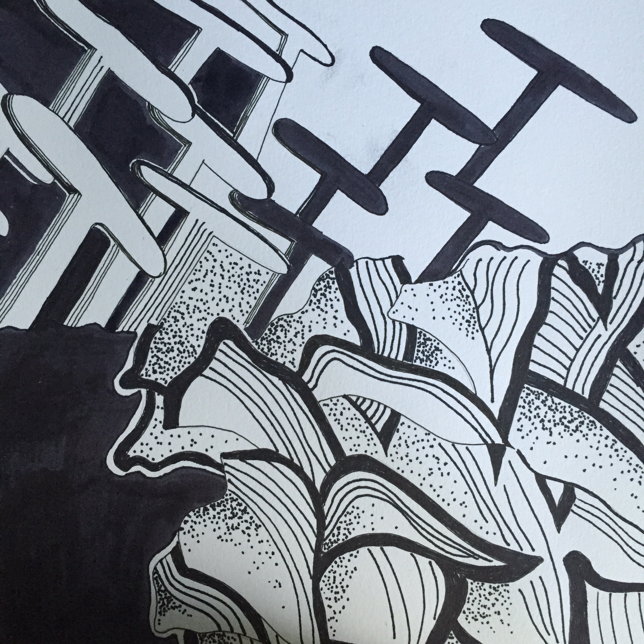 Project: on an 8.5X8.5 piece of drawing paper create a pen and ink drawing. Divide your composition into 4 unequal spaces, using very light lines. Chose a flower to draw. Put a pattern seen in the flower in the largest section, shade one section black, leave a section white, put three different textures possibly seen in your flower in the other section.